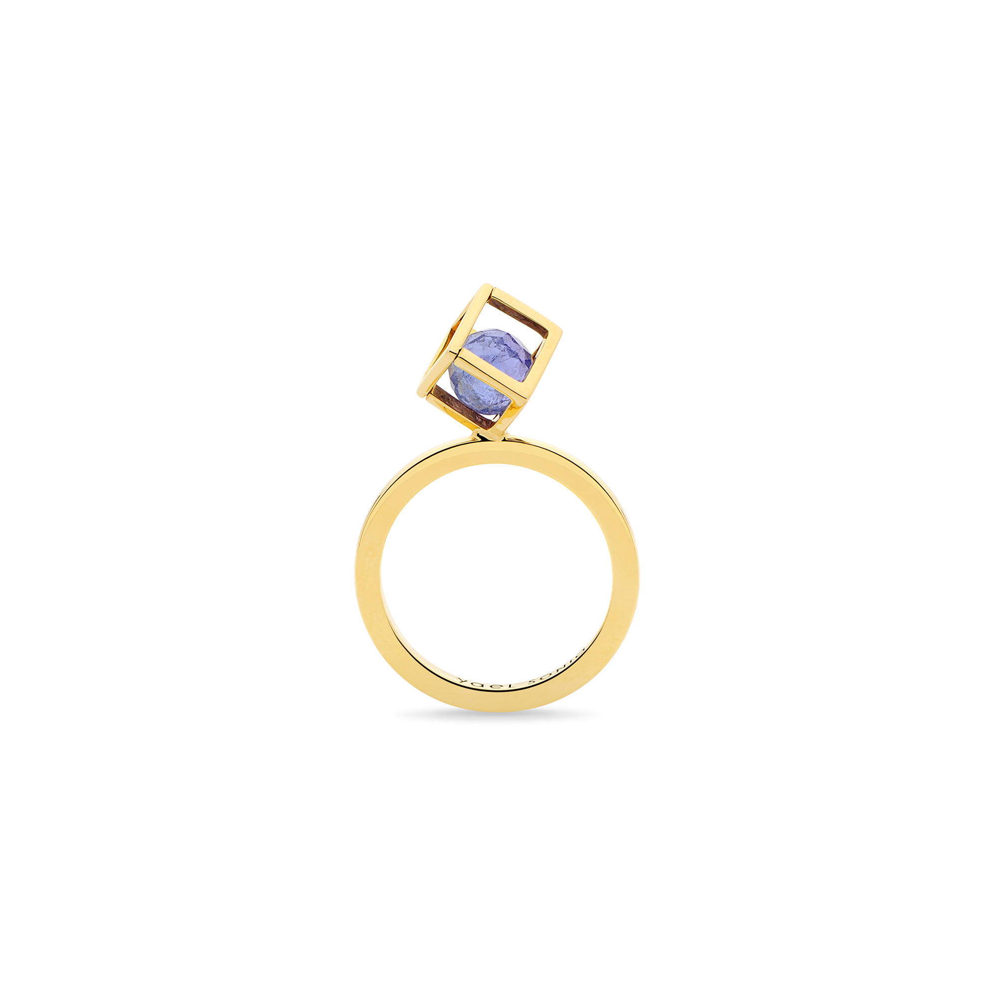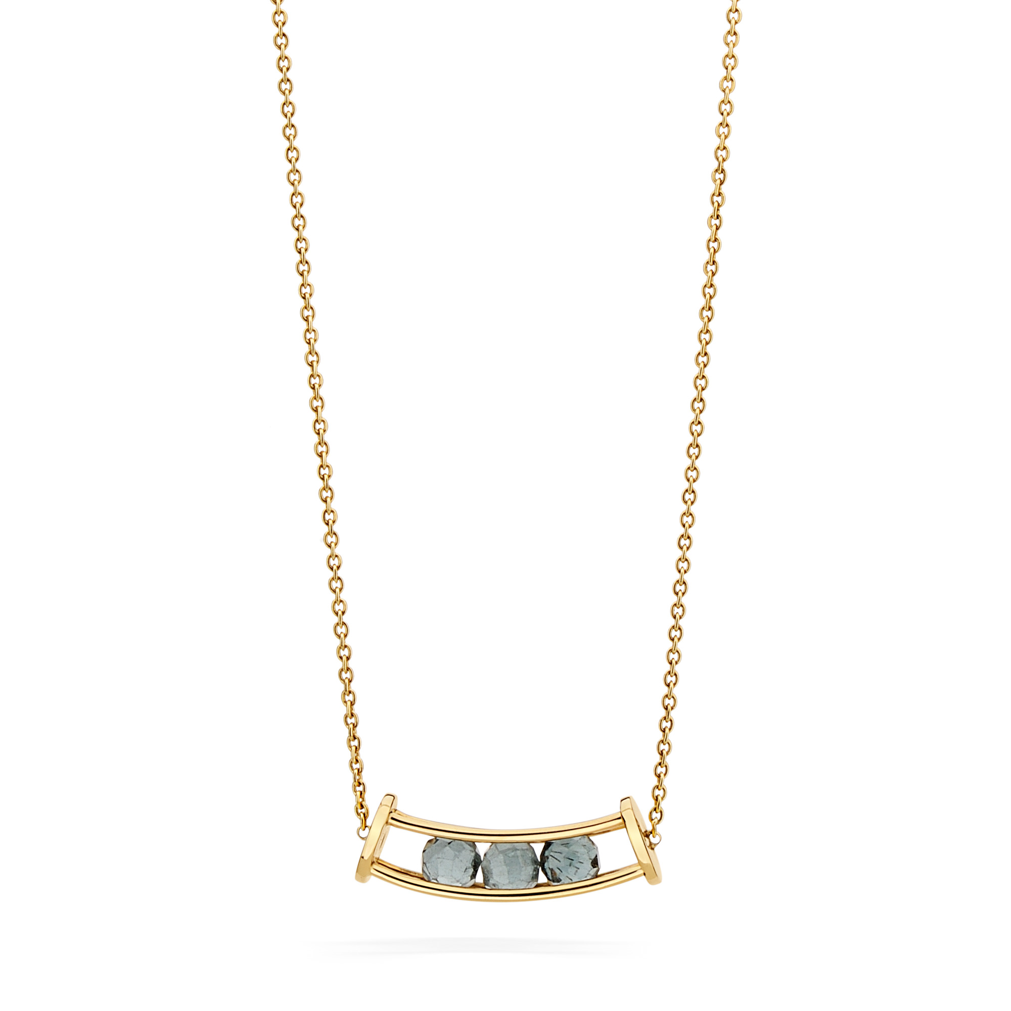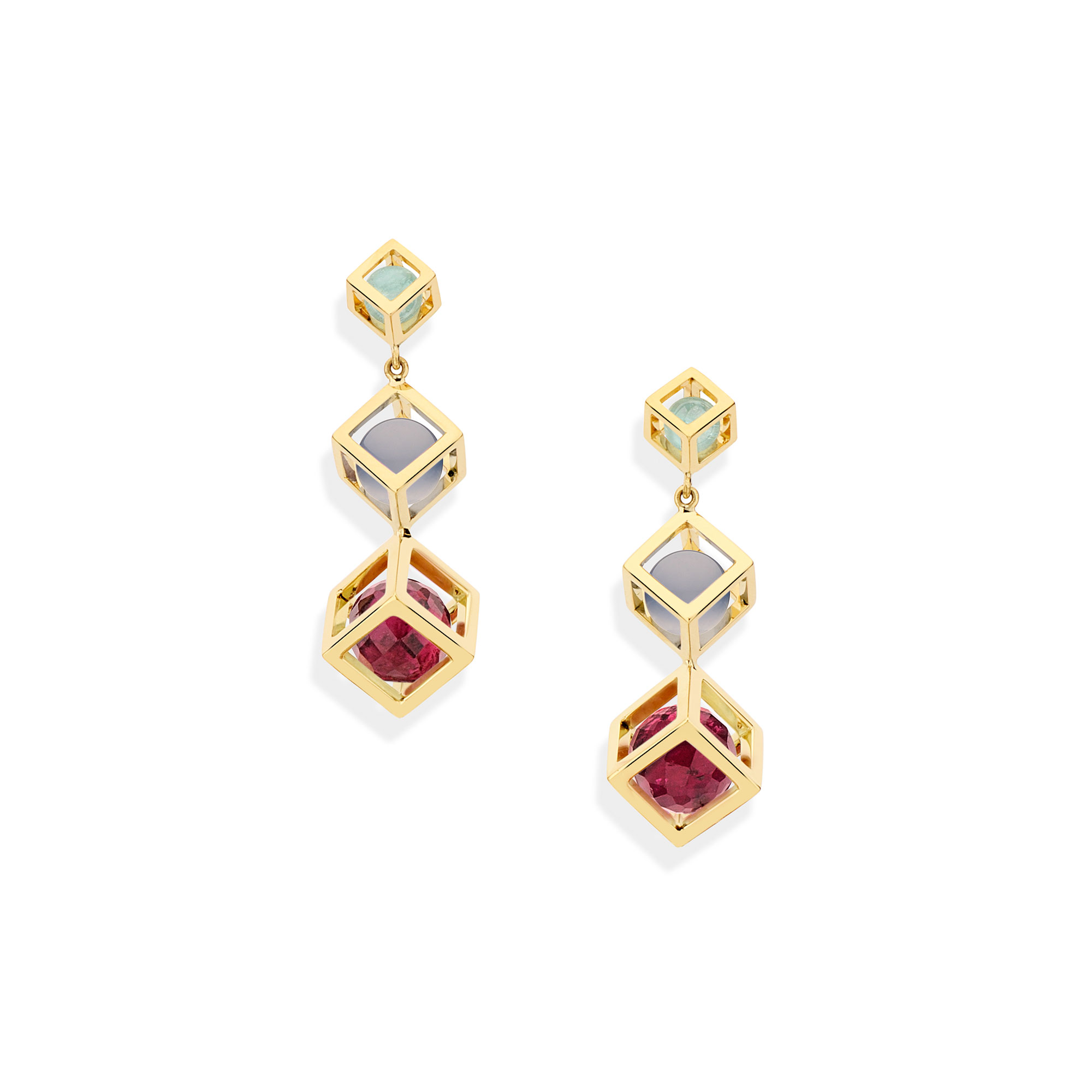 Gems set free, jewelry that comes alive. The Perpetual Motion jewelry collection is a confluence of graphic lines and spherical gems that has a powerful effect on those who wear it and those who view it. Each piece accompanies a woman’s movements. This is kinetic jewelry that creates melodic sounds that are unique to her rhythms, a series of taps and rolls that create their own soundtrack. Jewelry in motion, made with vividly colored, smooth and faceted gemstones in all shades of the rainbow, from pale blue aquamarines to vivid orange carnelian, milky purple amethyst and deep pink tourmalines. The kinetic jewelry is defined by gemstones that are lined up and ready to roll in bracelets, framed on the edge of rings, and dangling in golden cube pendants that cascade from tiny circles to globular gumballs. Curves and spinning wheels give kinetic jewelry and the gemstones inside even more latitude for movement as they roll and glide on golden tracks, swaying from side to side or coming full circle again and again. They are playful elements within the motion jewelry collection, one that captures the magic of childhood toys and all the wonder that accompanies them, but with the bold sophistication of a grown-up treasure.