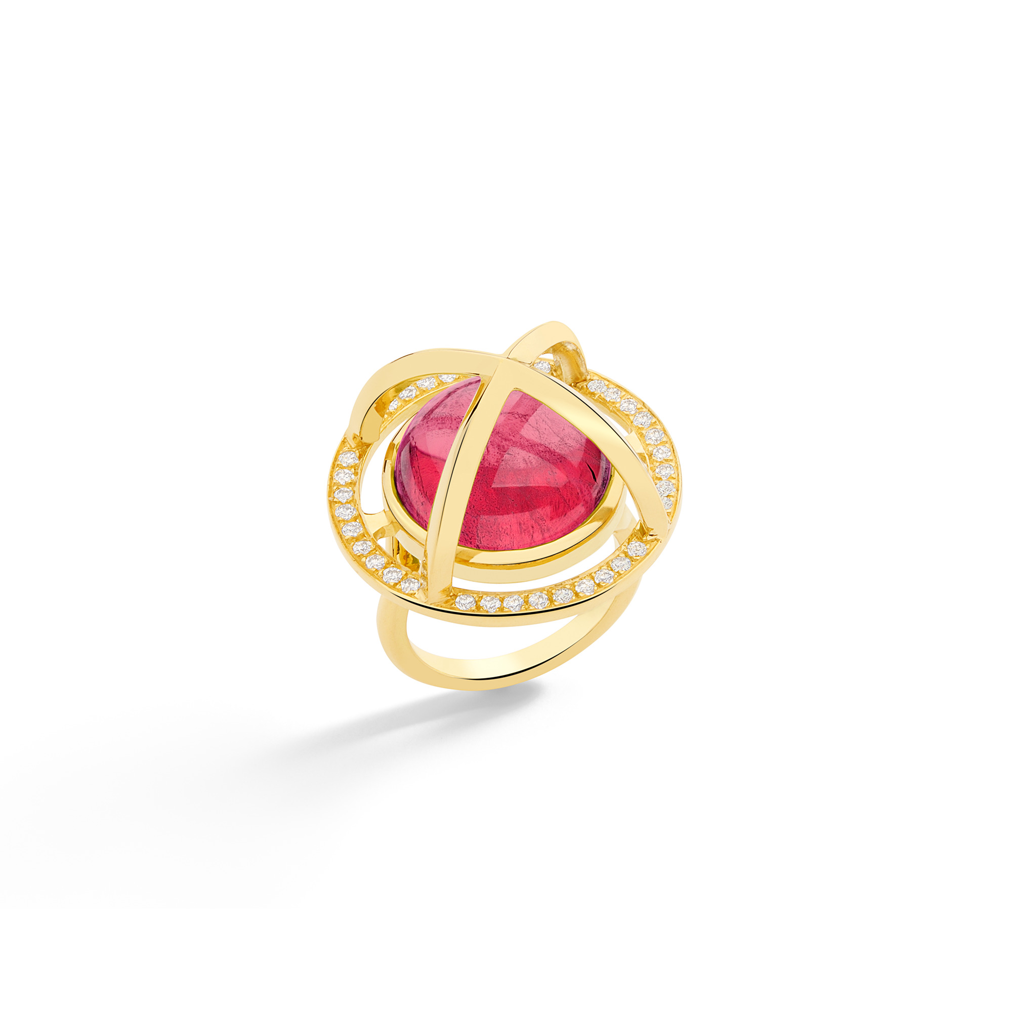 Gems set free, jewelry that comes alive. The Spinning Diamond Necklace is a Yael Sonia signature that captures motion and playfulness with a diamond and rubellite pendant. The Perpetual Motion jewelry collection includes rubellite necklaces that reimagine gemstones that can be self-serious into unexpected necklaces and statement pieces. The confluence of graphic lines and custom-cut gems has a powerful effect on those who wear it and those who view it, expanding the possibility of what a spinning diamond necklace can be. Each piece accompanies a woman’s movements, with the rubellite necklace creating melodic sounds that are unique to her rhythms, a series of taps and rolls that create their own soundtrack. Made with 18k yellow gold and a custom-cut rubellite sphere that swirls inside an open frame, this Spinning Diamond Necklace is often given as a singularly striking gift for oneself or a loved one. This rubellite pendant is marked by a circular track tied with three diamond-studded links. This is a transporting piece that never stops moving, and is hypnotizing to watch. The rubellite pendant captures the magic of childhood toys and all the wonder that accompanies them, but with the bold sophistication of a grown-up treasure.