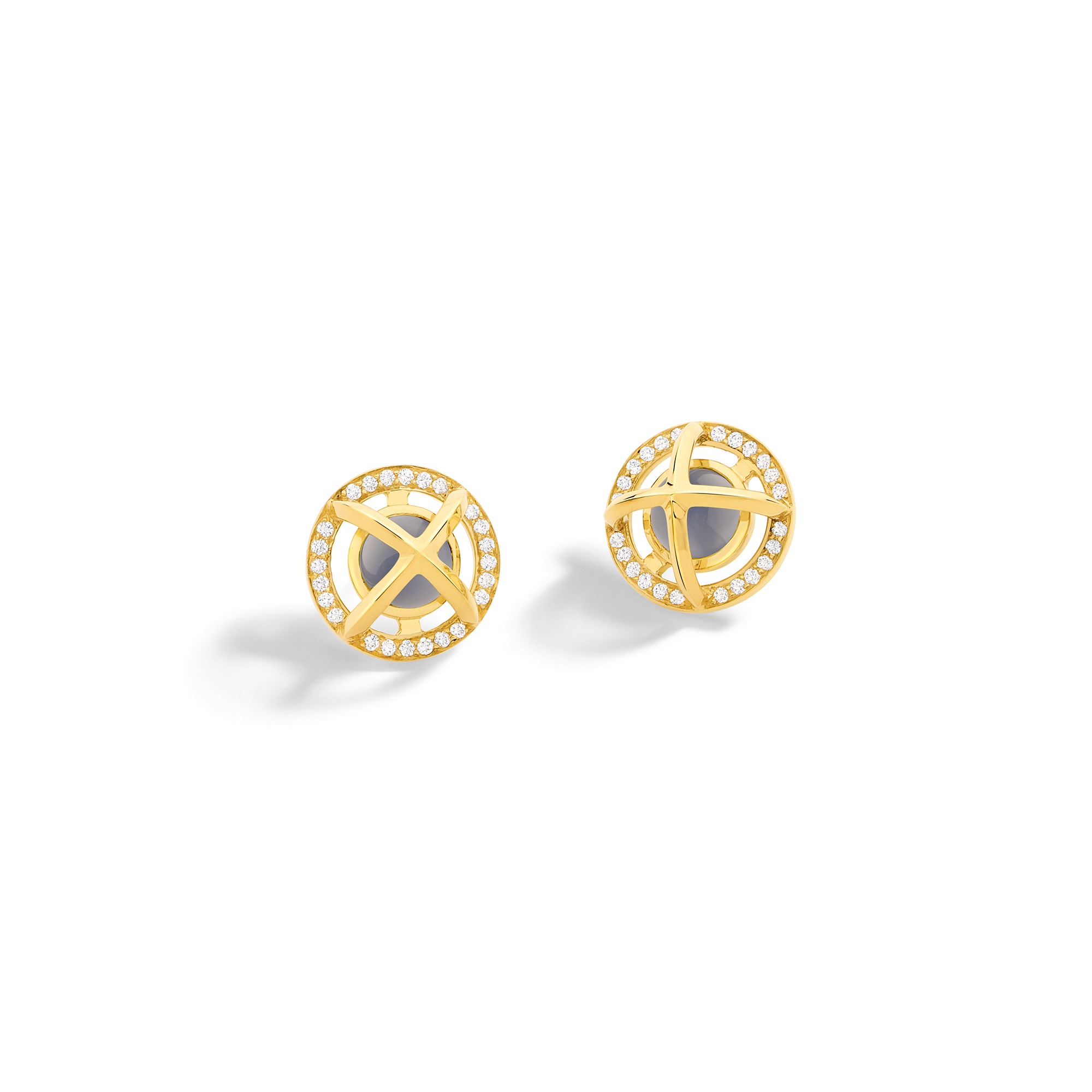 Design Insight: A crisscrossed 18k gold frame with diamond pavé protects a polished cabochon held at the center.