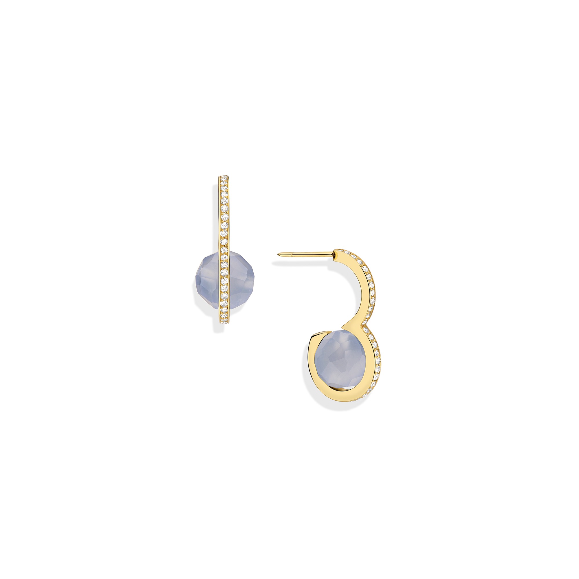 Chalcedony Stud Earrings feature a faceted stone that juts off the lobe, making it a stud that goes far beyond the basic. It sits cradled in the nook of a diamond-topped gold setting designed to illuminate its natural silhouette. Yael Sonia sources semiprecious and precious stones to create chalcedony stud earrings that are uniquely modern and made for women in motion.The Rock collection is multi-colored stone jewelry made with stones like chalcedony that are mined and hand-cut into hammered, multifaceted shapes and set in stud earrings. The chalcedony stud earrings become rough-hewn jewelry that reflect that of gemstones found in nature as though they have been untouched and discovered in the raw. A smooth, spare jewelry setting emphasizes the impact of each colored gemstone, and redefines what it means to really rock a rock. Using colored gemstones such as amazonite, chalcedony, and rainbow-colored tourmalines, as well as aquamarine, citrine, and the pale green prasiolite, Yael Sonia creates stud earrings and stone jewelry that is wearable and modern, made for everyday and special occasion use. From yellow gold cocktail rings to delicate earrings, spare cuffs, and pendant necklaces, there is a style and hue for every woman, with pieces set against 18-karat yellow gold and sprinkled with pavé diamonds.